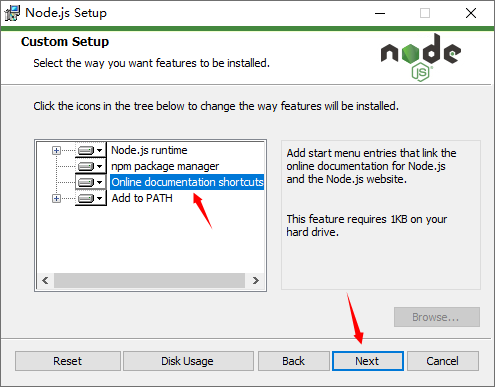 先安装node.msi这个脚本,安装位置不要改动否则会出现问题,到这里选择第三个Online documentation shortcuts,之后一直下一步完成安装即可。