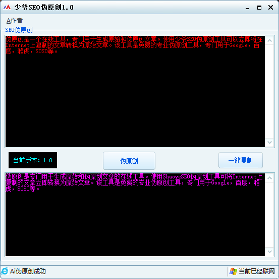 少爷SEO伪原创是一个在线工具伪原创工具,专门用于生成原始和伪原创文章。使用少爷SEO伪原创工具可以立即将在Internet上复制的文章转换为原始文章。该工具是免费的专业伪原创工具,专门用于guge,百度,雅虎,SOSO等。