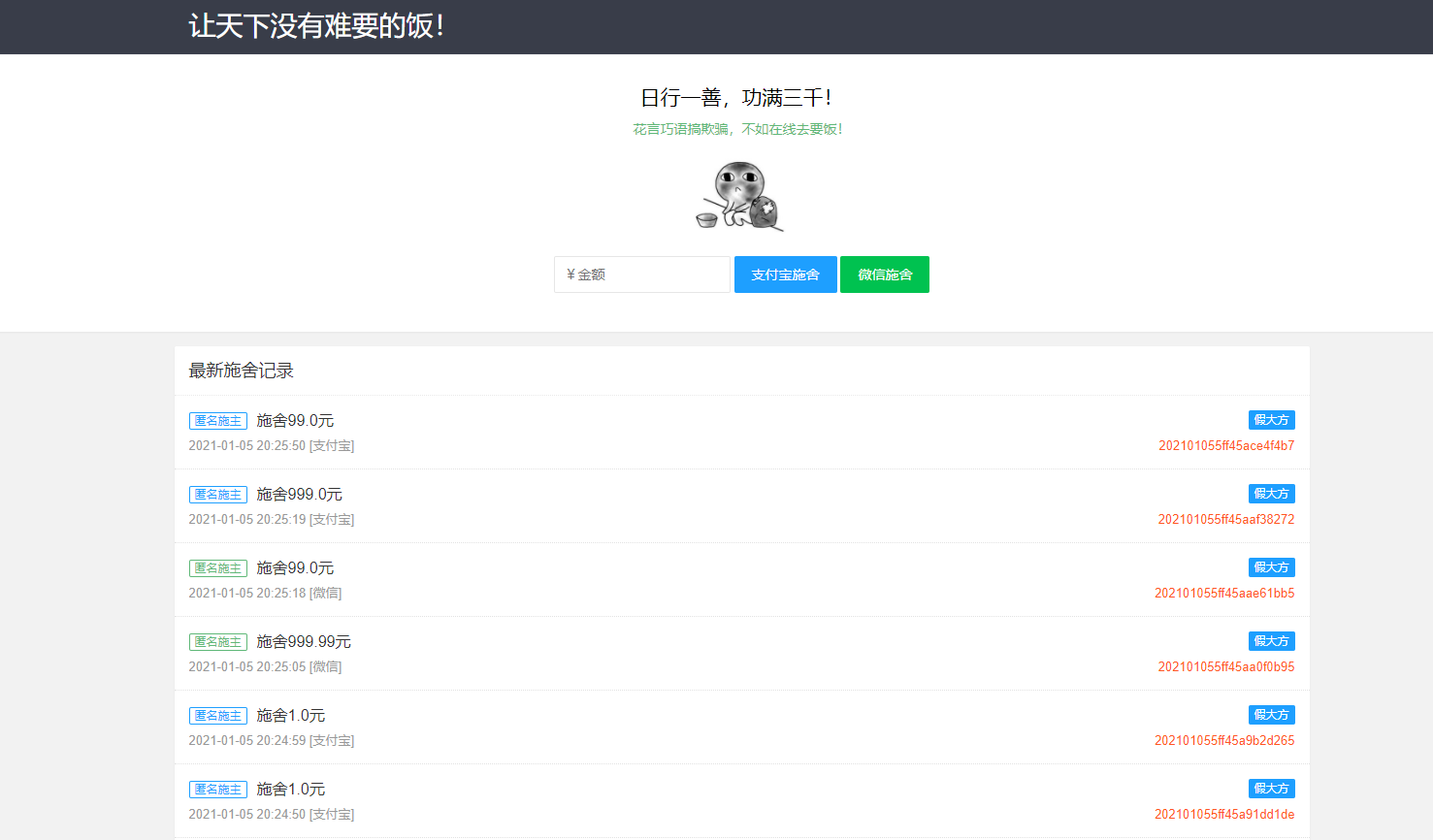 疫情散发,日子难过,那不如来要饭吧;有人说直接挂个收款码不就完啦,但是,你考虑施舍人的感受了吗??施舍也要讲究便捷,如果能像购物一样,那也是很美的一件事情;BUT线上的支付基本都需要企业资格才能开通,最起码也要是个体工商户才可以(有营业执照),用第三方支付随时担心跑路,自架支付没那本事,还好支付宝的当面付可以个人免签约,当然有些限制,要个饭是够了!