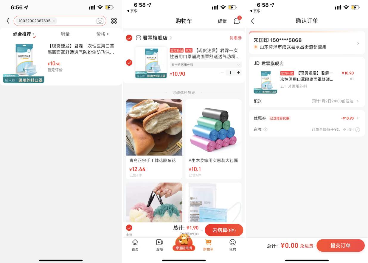 本次为大家分享的是京喜0元购买50只一次性口罩 先领券再下单