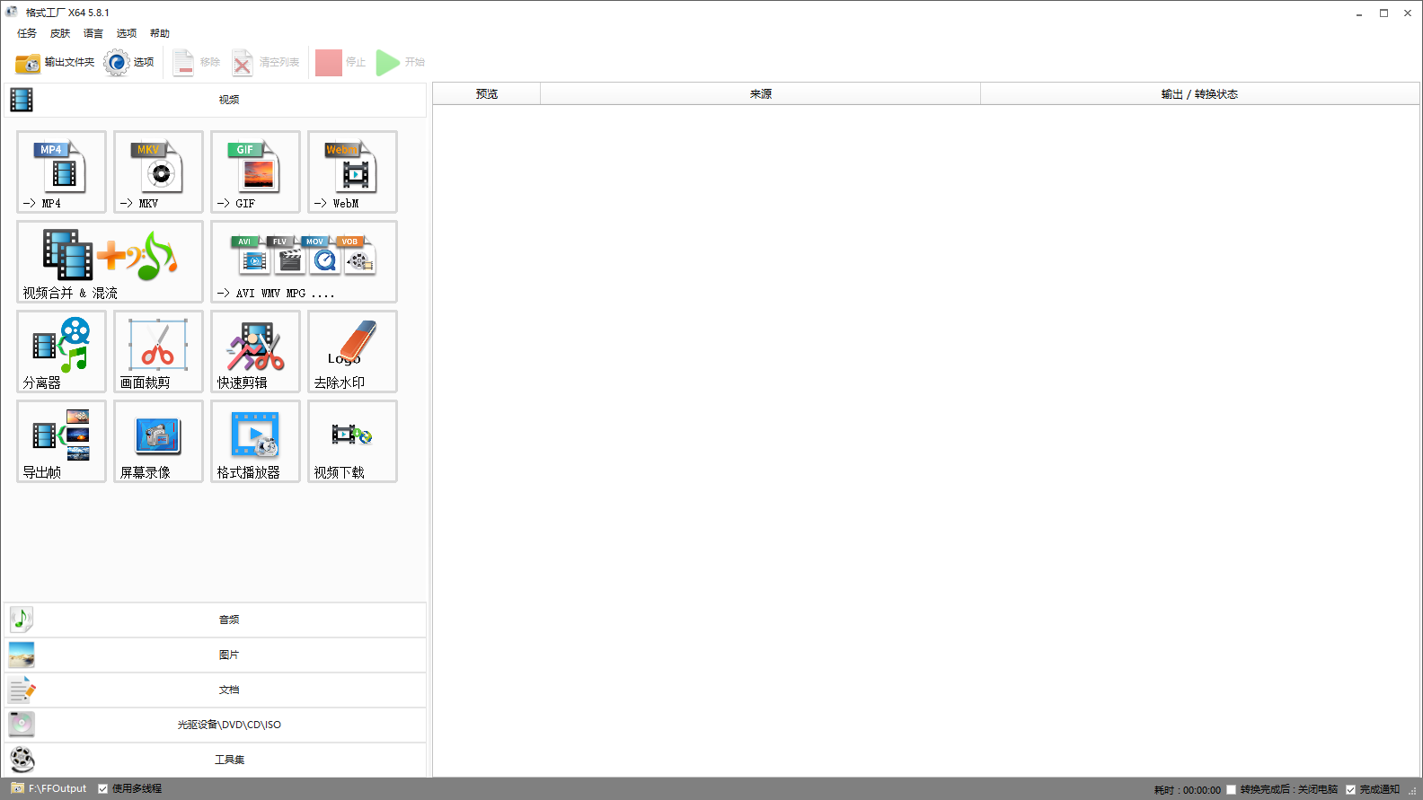 格式工厂是套万能的多媒体格式转换器,提供以下功能:所有类型视频转到MP4/3GP/MPG/AVI/WMV/FLV/SWF。所有类型音频转到MP3/WMA/MMF/AMR/OGG/M4A/WAV。你可以在格式工厂中文版界面的左侧列表中看到软件提供的主要功能,如视频转换、音频转换、图片转换、DVD/CD/ISO转换,以及视频合并、音频合并、混流等高级功能。格式工厂强大的格式转换功能和友好的操作性,无疑使格式工厂成为同类软件中的佼者。