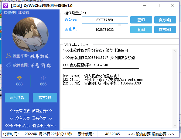 冷风QQ/WeChat绑手机查询是一款就是有QQQQ/WeChat号来查询此号绑定的多少手机号工具软件,一般是查询QQ绑定手机号,这个是反过来的,非常的不错,那你还在等什么,赶快下载吧。