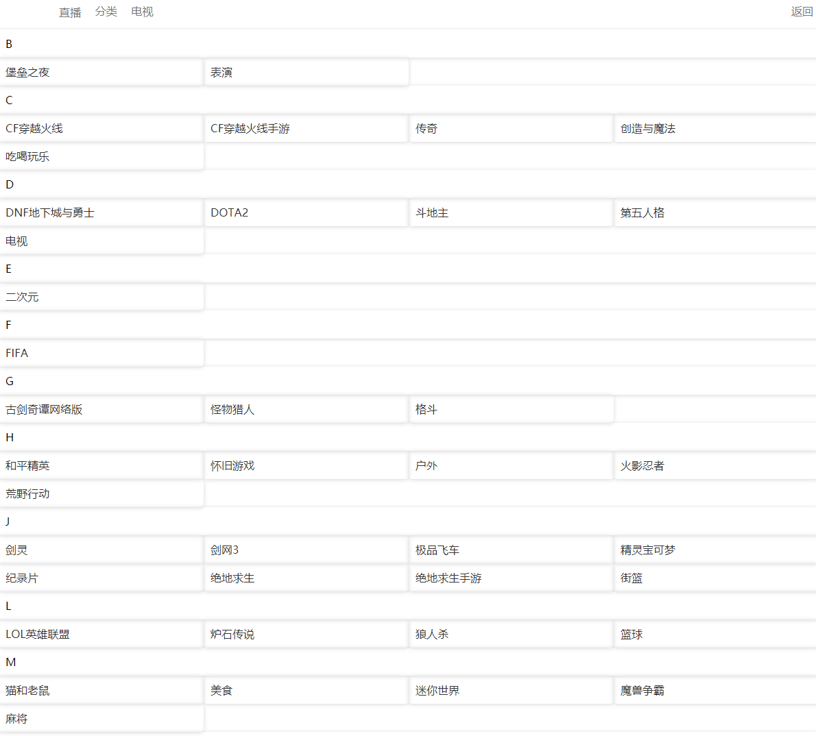 将斗鱼、虎牙、触手、YY、龙珠、战旗5章鱼、电视直播按分类/关键词聚合,用户选择分类,可以观看到全网该关键词下正在直播的内容。